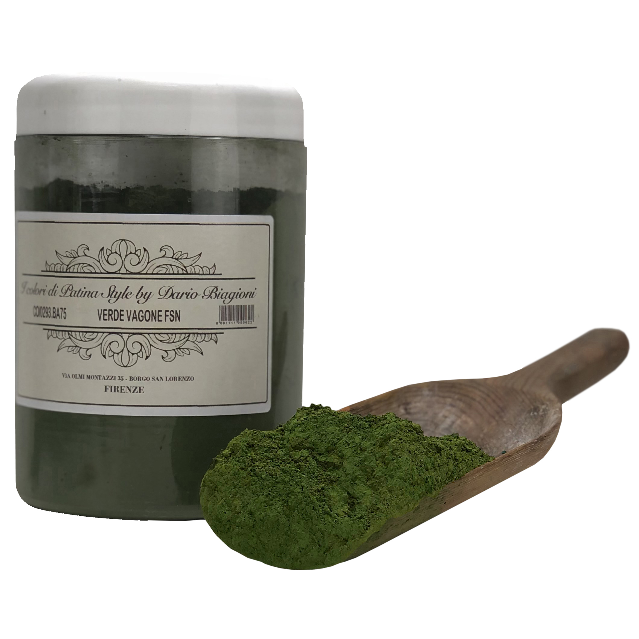 Verde Vagone FSN – Prodotto a base di pigmento giallo, pigmento verde e pigmento marrone, trattati e fissati su carbonato di calcio. La tinta, scura ma non compatta, permette di creare effetti di trasparenza.