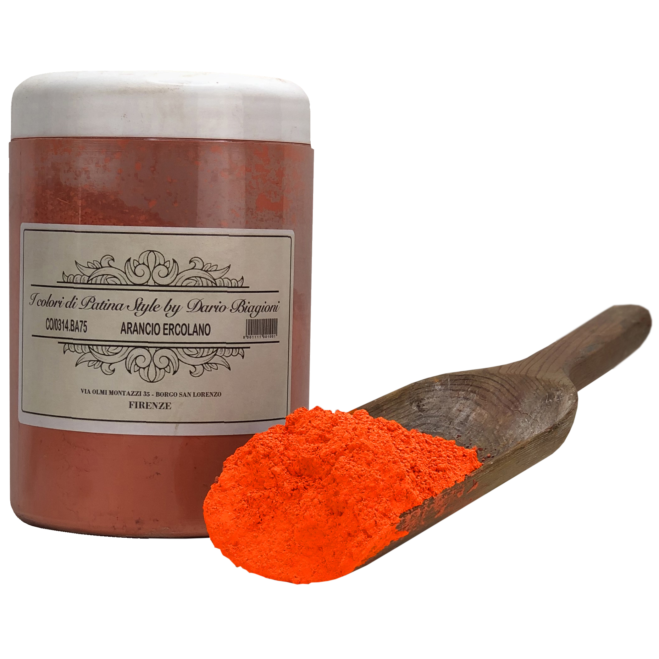 Arancio Ercolano – Pigmento disperso su carbonato e solfato di calcio. Dopo questo trattamento il pigmento può essere utilizzato in varie tecniche pittoriche. Come gli altri pigmenti in polvere che ho scelto per lo Shop di Patina Style, anche l’Arancio Ercolano è completamente biocompatibile ed innocuo per la salute.